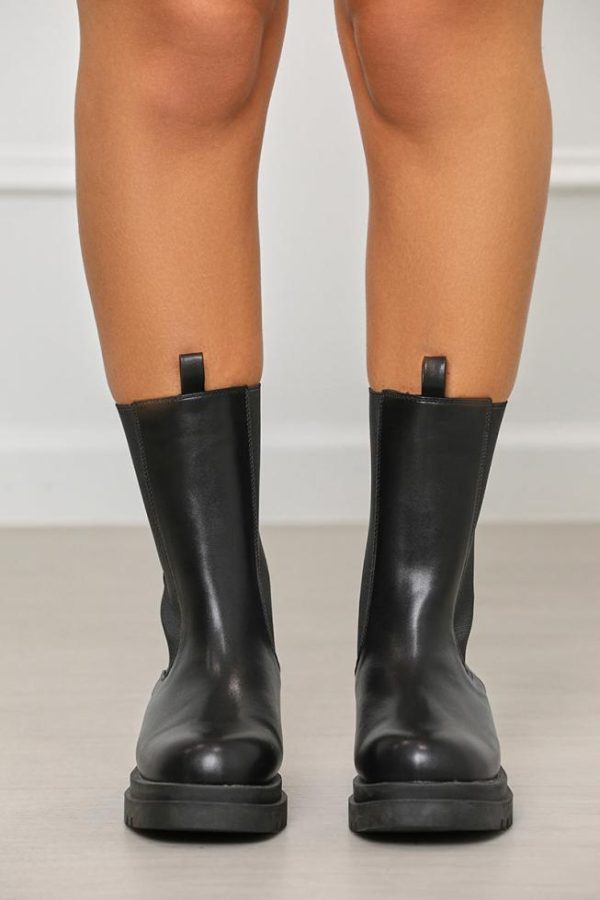 Take your look to all new heights in these chunky boots featuring a faux leather material and chunky sole; we’re obsessed! Add these hot boots to your outfit to elevate your look.Black