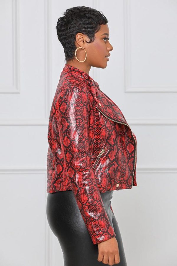Give your wardrobe a chic edge this season with this snake print jacket. Made of soft material that has a great stretch. This jacket comes fully lined with a classic neckline, side pockets and a zip closure. Layer this jacket over a monochromatic top and bottom, sleek bootie and handbag for a complete fierce look!