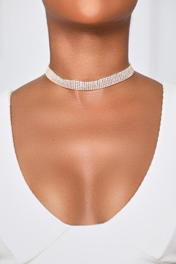 This gold rhinestone-encrusted choker definitely adds a touch of elegance to your look! Features include clasp closure and a short chain in the back to adjust length.
