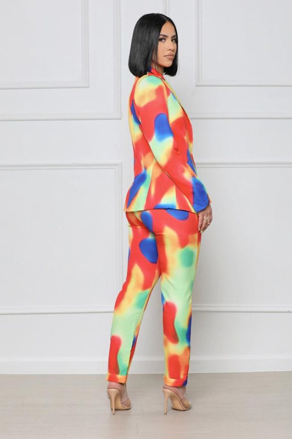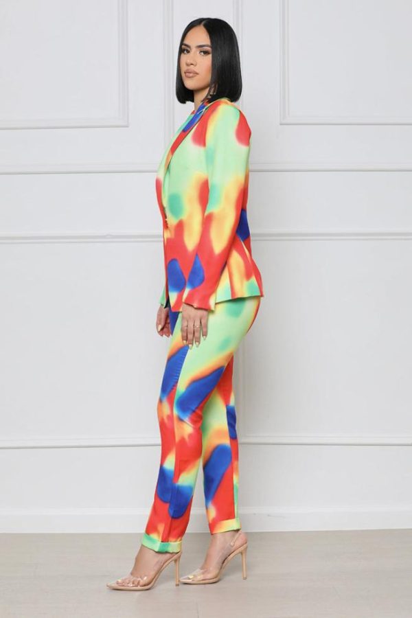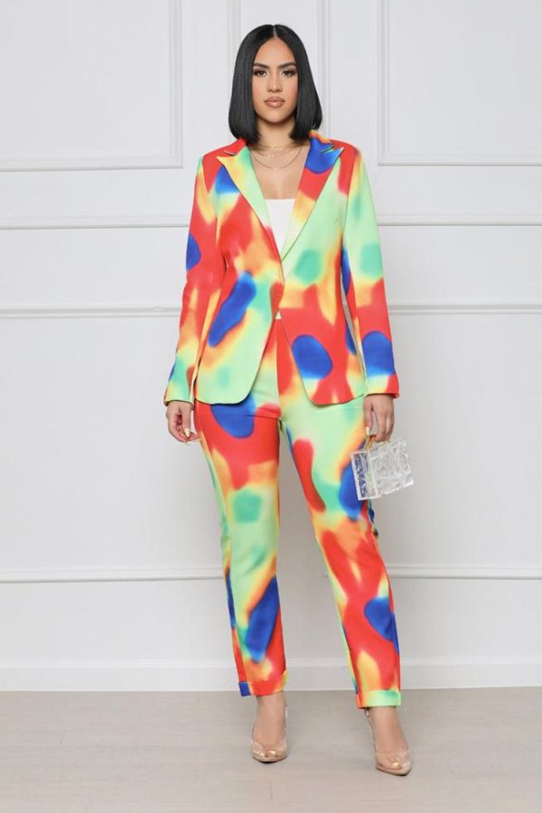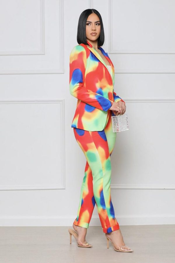 We love a good blazer set, especially when it’s this colorful! This set features a fully-lined straight leg pant in a watercolor material, zip closure, side pockets, and a matching fully-lined blazer with silver clasp closure. Pair with a classy high heel pump and a mini bag for a look that’ll demand attention.