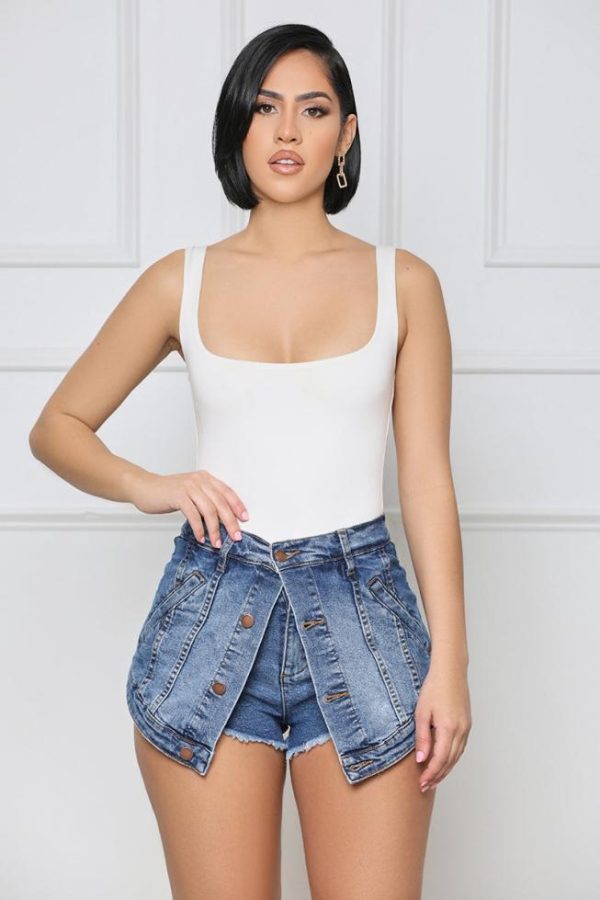 Looking to add something new and different to your denim kollection?This skort, featuring a medium wash denim short under a jacket-like overlay with side pockets, and button and zip closure is the perfect piece!Pair with a basic bodysuit, gold accessories, and a high heel for a fun and flirty look!