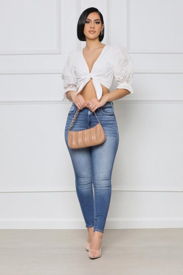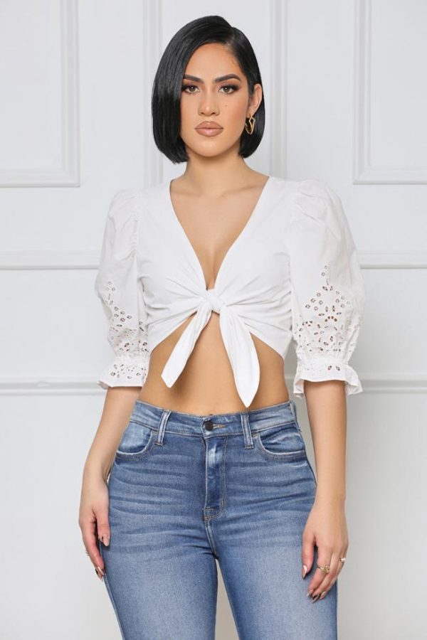 This super cute crop top comes features a front tie closure andeyelet detailed 3/4 sleeves. Perfect for an elevated casual look, just pair with high-rise jeans, a chic high heel, and gold accessories for an outfit you’ll definitely love.